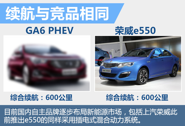 在国家政策刺激下,包括比亚迪、上汽荣威等自主品牌逐步向新能源市场布局,但采用插电式混合动力的车型并不多见。相比于纯电动车,插电式混合动力形式的技术更加复杂,而且目前国内采用插电混动形式的产品级别均在紧凑型以上。上汽荣威e550是GA6 PHEV主要竞争对手,采用插电式混合动力形式,纯电续航和综合续航也分别达到80公里和600公里。