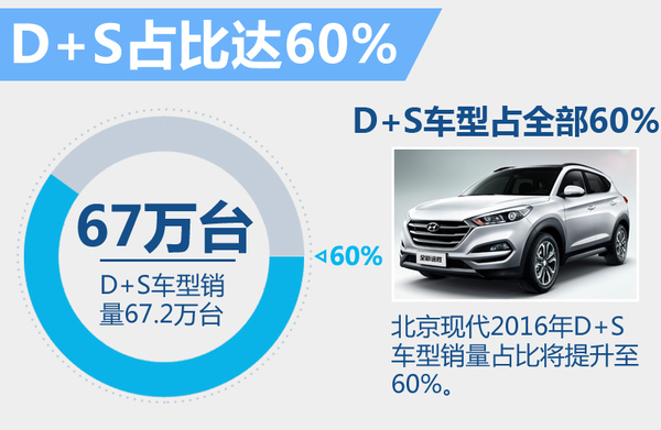 北京现代2016年“D+S战略”车型销量占比目标为60%,即D+S车型全年销量将达到67.2万台。北京现代2016年还将推出的6款新车(悦纳、第九代索纳塔混动版、名图1.6T、ix25 1.6T、改款全新胜达以及2016款朗动)中,包含4款D+S车型,这四款车型将与全新途胜和第九代索纳塔等车型一道,为完成D+S车型销量占比目标达60%做出贡献。