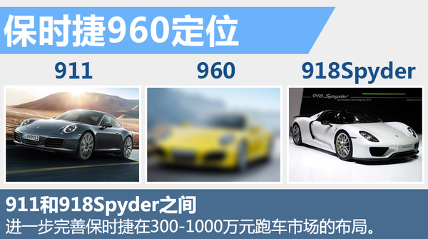 目前保时捷在跑车市场中已有保时捷718、Boxster、保时捷911和保时捷918 Spyder四大系列。从售价上看,在300万元至1000万元区间的产品布局上处于空缺的状态。新车定位在保时捷911和保时捷918Spyder之间。保时捷960的推出将填补目前这一市场的空缺。