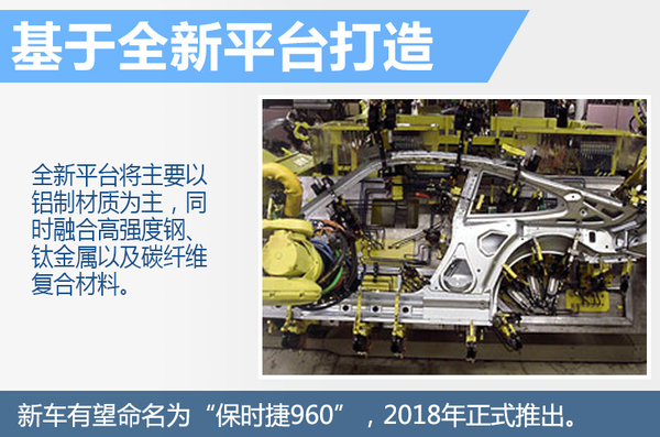 新车基于保时捷的全新平台打造。这一全新平台主要以铝制材质为主,同时融合高强度钢、钛金属以及碳纤维复合材料。轻型材料的大量使用,使得新车的整车质量将控制在1,500千克以内。保时捷新超跑有望命名为“保时捷960”,在2018年正式推出。