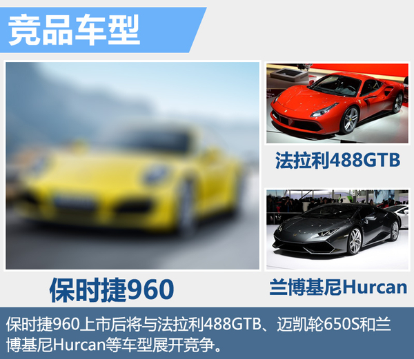 目前300万元以上的跑车市场中已有法拉利488GTB、迈凯轮650S和兰博基尼Hurcan等车型。其中法拉利488GTB搭载一台3.9升涡轮增压八缸发动机,整车质量1,475千克,售价为338.8万元。保时捷960全新的八缸发动机与更轻的整车质量的结合能否战胜法拉利488GTB,还需等到上市后见分晓。