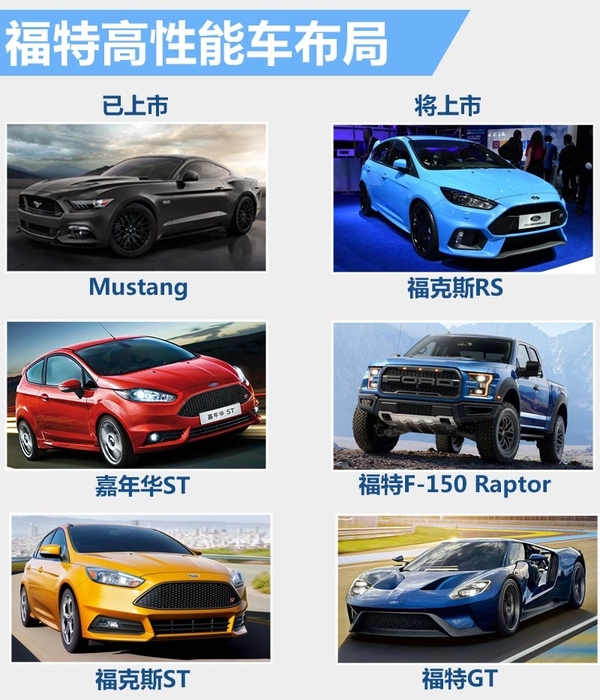 目前,福特在华已经投放了Mustang、嘉年华ST、福克斯ST三款产品。福特已为中国市场规划了更庞大的高性能车家族,未来两年将有至少3款新车引入国内。福特高性能车型的诞生最早可追溯到1964年第一代Mustang的推出,直至今日,Mustang车型已经推出第六代产品。福特在高性能车研发的道路上走过了50多年。2014年,福特并整合旗下福特赛车、福特SVT系列车型、福特RS车型的开发部门成立福特高性能部门(Ford Performance)。