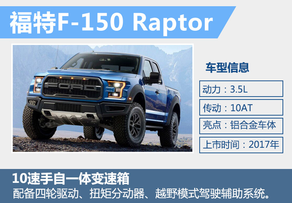 福特汽车不久前官方宣布,将在2017年正式在中国市场引进全新福特F-150 Raptor车型。新车采用高强度铝合金车体,减轻了整车质量。动力方面,新车搭载福特第二代3.5升EcoBoost发动机,匹配一款全新10速手自一体变速箱。全新的四轮驱动、扭矩分动器,以及越野模式驾驶辅助技术的应用,进一步提高越野路况上的行车通过性。另外,福特GT超跑目前也已接受中国地区的预定申请,预定成功的订单将于2016年下半年排产。