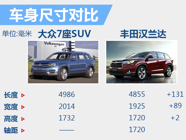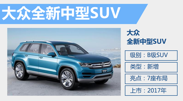 根据大众集团此前公布的规划,定位高于上汽大众途观的中型SUV,将是一款采用7座布局设计的车型。这款中型SUV将根据大众CrossBlue概念车进行打造,新车使用大众全新的MQB模块化平台,并采用七座布局的座椅设计。这款新车将有望在明年以国产的形式引入国内,与同属中型SUV细分领域的丰田汉兰达锐界等车型展开竞争。
