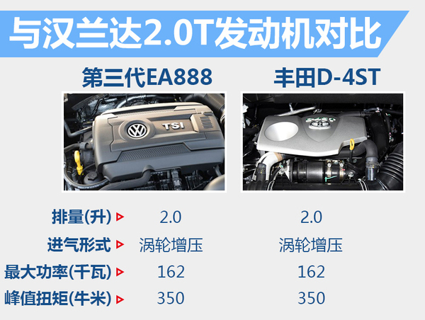 动力方面,新车将有望搭载大众第三代EA888系列的2.0T发动机,其最大功率为162千瓦,峰值扭矩达350牛米,与汉兰达2.0T排量车型的动力表现持平。随着小排量增压化趋势的发展,不排除这款中型7座SUV上会搭载排量更小的发动机。