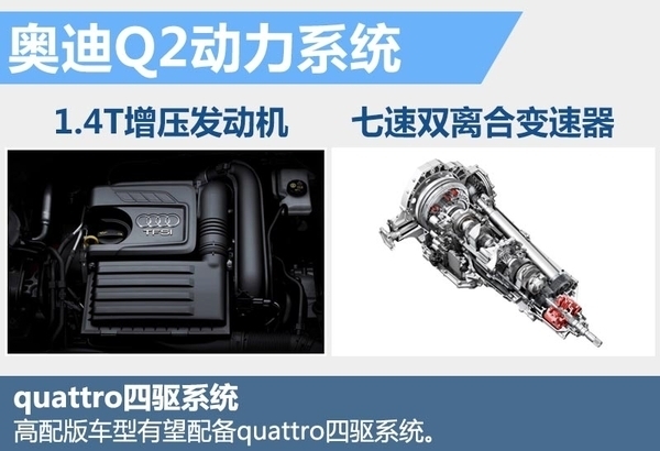 动力方面,Q2将提供1.0T、1.4T和2.0T多种动力选择,发动机功率范围也从85kW-140千瓦不等,其中1.0T车型将采用三缸涡轮增压发动机来拉低售价。并且奥迪Q2将全系标配7速S tronic变速器。预计在明年将率先以进口的形式引入搭载1.4T涡轮增压发动机的车型。