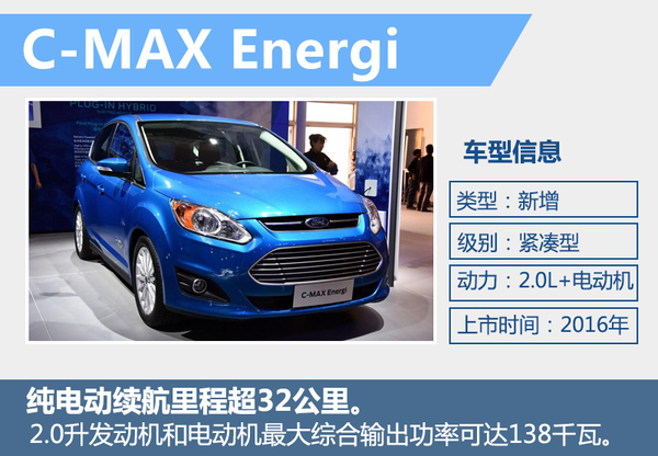 在新能源方面,C-MAX Energi和蒙迪欧混动版两款车型年内将投放市场。C-MAX Energi动力由2.0升发动机和电动机组成,最大综合输出功率可达138千瓦。最大续航里程885公里,纯电动续航里程超32公里纯电极速可达135公里每小时。