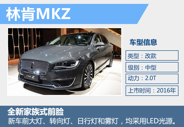 林肯MKZ的改款车型也将在今年推出,新车最大的变化来自于前脸部分,摒弃了现款车型飞翼式格栅设计,采用近似旗舰轿车Continental大嘴式格栅。前大灯、转向灯、日间行车灯和雾灯,均采用LED光源。动力上新款MKZ延续现款的动力组合,搭载2.0T涡轮增压发动机,分为高、低功率两个版本。传动系统方面,与发动机匹配的是一台6速手自一体变速箱。