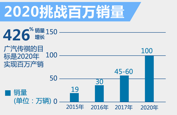 2015年广汽传祺累计售出19万辆,同比增长63%,今年一季度累计销量达8万辆,劲增171%,广汽传祺的整体销量呈迅速增长态势。在今年,广汽传祺将向30万辆发起冲刺。根据广汽传祺规划,到2017年传祺将实现50万的产能,到2020年实现100万辆的产能,为百万年销量提供支撑。