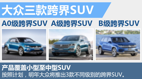 根据大众的相关规划,在2017年将推出3款跨界SUV产品。其中全新B级跨界SUV将基于MQB平台进行打造,新车在外观方面,采用了大众最新的家族式设计风格,与全新一代途观有几分相似。大众B级跨界SUV有望搭载第三代EA888的2.0TSI发动机,目前已广泛搭载到大众旗下的多款车型上,最大功率162千瓦,最大扭矩350牛米。除此之外,新车还有望搭载一款途锐所采用的3.0升的六缸涡轮增压发动机,最大功率235千瓦,最大扭矩达到了440牛米,保证新车有着充足的动力性能。另需说明的是,大众A0跨界级SUV和A级跨界SUV对应的轿车平台为高尔夫和Polo,同时A级跨界SUV还首次采用敞篷车身,一定程度上透露了大众未来的发展路线。