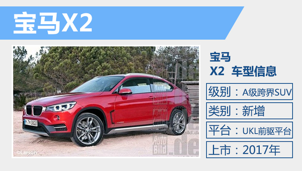 宝马X2定位为A级跨界SUV,基于UKL前驱平台打造而成,外观上与全新宝马X1相似,可将宝马X2当做全新宝马X1的Coupe版本,但宝马X2的造型更为运动。新车动力配备与全新宝马X1相似,搭载多款汽油和柴油发动机。其中,2.0升涡轮增压四缸汽油发动机的最高功率输出为170千瓦,峰值扭矩为350牛·米。另外,该车未来还将推出配备M套件的车型可选。