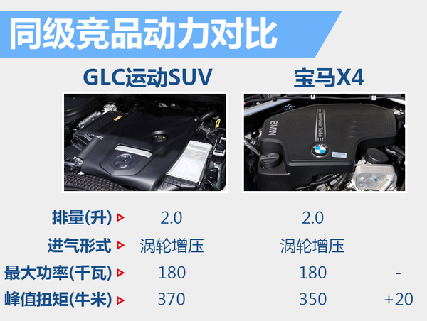 动力方面,奔驰GLC运动SUV预计将沿用GLC所搭载的M274系列2.0T发动机,通过不同调校可实现多种不同动力版本,其中以GLC300 4Matic Coupe为例,可实现180千瓦的最大功率输出值,峰值扭矩达370牛米。传动方面,与之匹配的有望是奔驰最新的9速手自一体变速箱。此外,GLC运动SUV还将推出一款AMG性能版车型。(