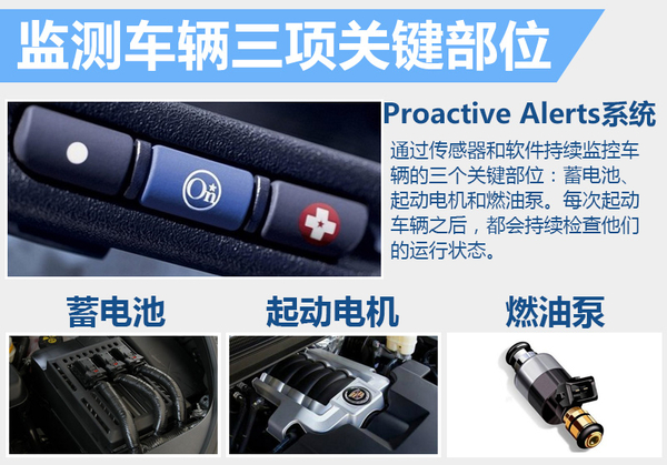 ProactiveAlerts技术综合运用传感器和软件,检测车辆每次发动时三个重要部件——电池、起动机和燃油泵——的性能表现。一旦这三个部件的性能开始退化,通用汽车将通过OnStar(安吉星)车载通信系统的远程信息处理服提醒司机需要将车辆送去维修检查。ProactiveAlerts功能包含在OnStar车载通信系统之内,不收取额外费用,但需要车主申请。