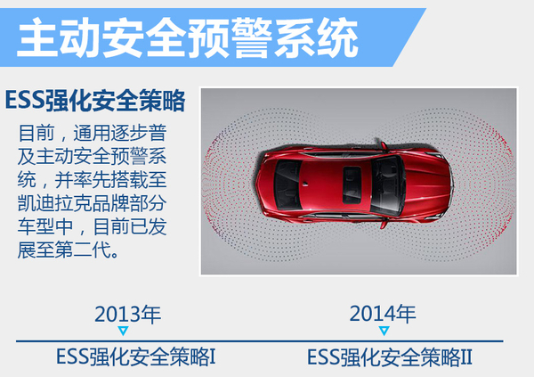 除了ProactiveAlerts系统外,通用在其他智能主动安全防护方面早已有布局。早在2013年,凯迪拉克针对旗下产品推出ESS强化安全策略I系统,基于监控摄像头、超声波和短距雷达等传感器等安全预警科技,并通过业界首创的震动安全座椅,实现一系列的提醒警示功能,比如前方碰撞预警和道路偏离预警等。2014年,凯迪拉克又推出进化版本——ESS强化安全策略II,在原有警示的基础上,全新安全系统增加了一些主动的驾驶行为干预功能,包括ACC自适应巡航系统和CMS防碰撞主动刹车系统等,智能化程度和现实道路环境下的实用性无疑又提升到一个新的台阶。