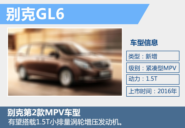 目前通用旗下三大品牌仅有别克GL8一款MPV车型,而国内MPV市场不断升温,一季度同比增长14.94%,高于平均增速。作为通用旗下的销售主力,别克品牌也计划完善MPV市场布局。上汽通用别克市场营销事业部部长包晔表示:“别克会不断在SUV、MPV上推出新产品,在不久的将来,会有全新的MPV的产品推出。”别克这款全新MPV或命名为GL6,有望搭载一台1.5T涡轮增压发动机。