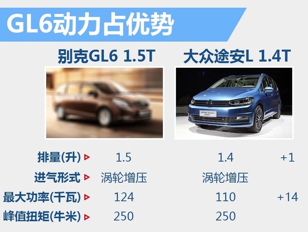 别克GL6上市后将主要与大众途安和丰田逸致等紧凑型MPV展开竞争。与刚上市的大众途安L(新一代途安)搭载1.4T涡轮增压发动机车型相比,GL6搭载的1.5T涡轮增压发动机占据优势,最大功率高出14千瓦。别克GL6上市后,填补了别克在中端MPV市场的空缺,在市场中的竞争力将得到进一步提升。