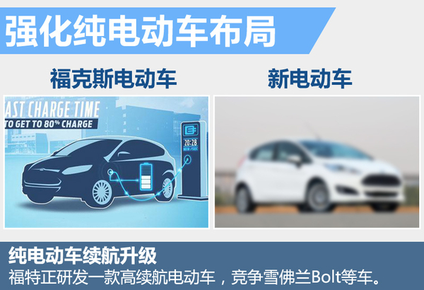 纯电动车也是福特新能源战略的重要一环。目前福特纯电动车主力产品是福克斯电动车,续航里程为76英里(约122公里)。今年推出的改款福克斯电动版续航里程提升至160公里。福特CEO马克·菲尔茨(Mark Fields)称,福特正在打造一款全新电动车,旨竞争雪佛兰Bolt和特斯拉Model 3。这台新车拥有更高的续航里程。未来这两款车均有望引入国内。