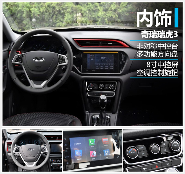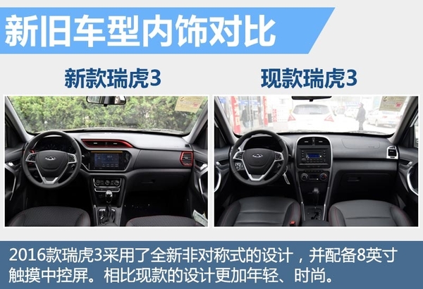 奇瑞汽车旗下产品阵容已经形成包括瑞虎、艾瑞泽等四大系列车型,其中瑞虎系列为SUV产品。瑞虎3最早于2005年推出,是国内自主品牌SUV市场中较早推出的车型之一。根据奇瑞规划,今年奇瑞体系下的第二代新产品将全面上市。目前2016款瑞虎3已经到店,网通社对新车进行了实拍。新车内饰使用全新非对称式设计,搭配红色饰板,更显年轻时尚;外观细节、配置应用等方面也有一定程度提升。