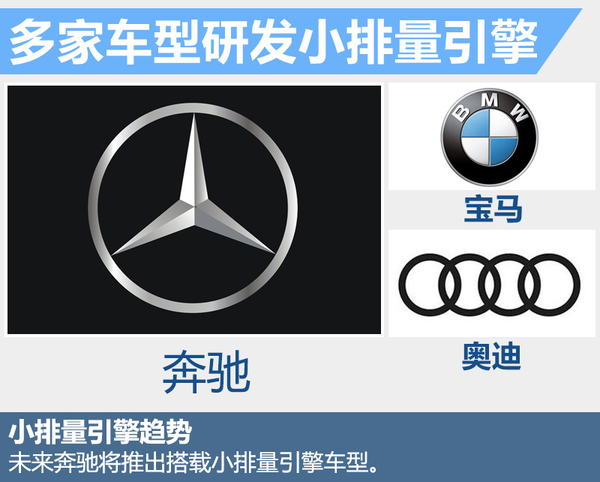 奔驰旗下车型在动力方面,大多搭载1.6升、2.0升和3.0升排量发动机,在低于1.6升排量发动机阵容方面还有待进一步扩充。目前国内汽车排放标准愈加严格,宝马已经搭载小排量的1.5T三缸增压引擎,奥迪作为大众旗下高端品牌,已开始应用1.4T发动机,同时1.2T及更小排量的动力装置也有所储备。