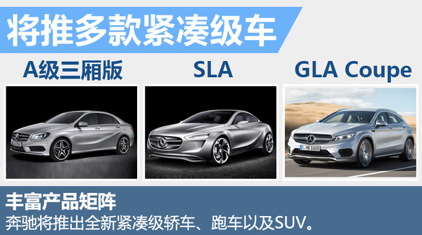 在紧凑级产品方面,奔驰将推出专为中国市场打造的A级三厢版车型。这款车是奔驰A级衍生的三厢版轿车车型,将与全新A级一同基于最新研发的MFA(模块化前驱架构)平台打造,在外观设计上将采用奔驰最新的家族式造型,最快预计将在2018年正式推出。在此基础上,奔驰还将在这一细分市场推出入门跑车SLA,以及紧凑级跨界SUV GLA Coupe,进一步丰富产品阵容。(