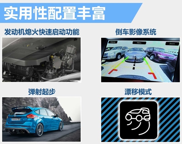 在游戏或影视作品中经常可以见到赛车原地拉高转速,然后轮胎冒白烟,车子如离弦之箭般火速飞出,这叫技能叫做弹射起步。福克斯RS就拥有这项配置。相对普通起步方式而言,一次完美的弹射起步能将一挡的加速时间减少一半。此外,福克斯RS搭载的发动机熄火快速启动功能、后倒车雷达、倒车影像系统、胎压监测系统等配置也是福克斯ST所不具备的。