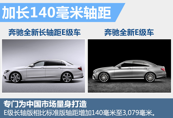 奔驰全新长轴距E级车是专门为中国市场量身打造的车型,更注重国内消费者对后排乘坐感受。同时对轴距进行加长,相比标准版轴距增加140毫米至3,079毫米。根据奔驰官方公布的信息,所加长的轴距全部用于提升后排空间,并提供了包括电动调节后排座椅、舒适头枕、后排触控屏等配置,更加迎合中国消费者的喜好。
