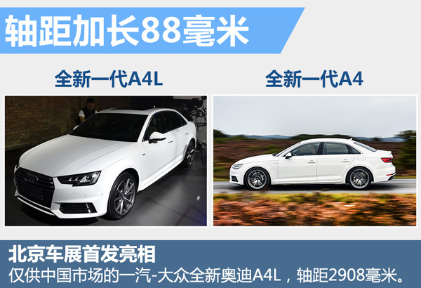一汽-大众奥迪全新一代A4L在北京车展首发亮相,新车的外观设计延续海外版设计风格,采用六边形进气格栅,并根据不同配置应用氙气大灯、LED前灯组以及矩阵式LED前灯组。不过在整车尺寸方面,全新A4L的长宽高分别为4,818*1,843*1,432毫米,轴距为2908毫米,相比海外标准轴距版加长了88毫米,针对后排空间实现进一步提升。