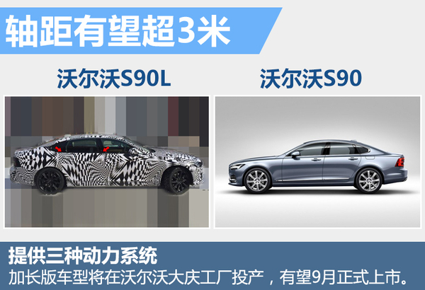 继沃尔沃S90海外部分市场上市后,沃尔沃针对中国市场将推出S90长轴距版车型,并有望命名为“S90L”。据悉,国产S90L新车后车窗的尺寸相比S90有所增长,这也是在原车型基础上进行轴距加长后最明显的变化。根据官方公布的信息,S90车身长、宽、高尺寸分别为4,963*1,879*1,443毫米,轴距2,941 毫米。国产后的S90L车身长度和轴距将进行加长,轴距有望超过3米,这将保证新车拥有更充足的空间。按照官方规划,S90长轴距版将在沃尔沃大庆工厂进行投产,新车有望在今年9月正式上市。