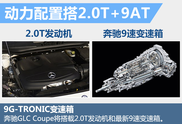 动力部分,奔驰GLC Coupe预计将会沿用GLC所采用的 M274系列2.0T发动机,通过不同调校可实现多种不同动力版本,其中以GLC300 4MATIC Coupe为例,可实现180千瓦的最大功率输出值,峰值扭矩达370牛米。传动方面,与之匹配的有望是奔驰最新的9速手自一体变速箱。