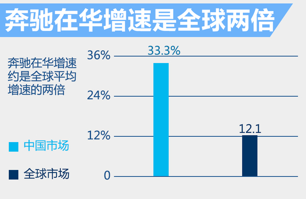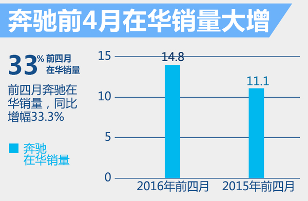 根据奔驰官方公布的信息,在2016年前四月,奔驰全球共销售新车647,550辆新车,相比去年577,603辆的数据而言,同比增长12.1%;中国作为奔驰在全球最新的单一市场,前四月累计销量为147,907辆,相比2015年同期的110,963辆,同比增幅高达33.3%,已约为全球平均增幅的两倍。
