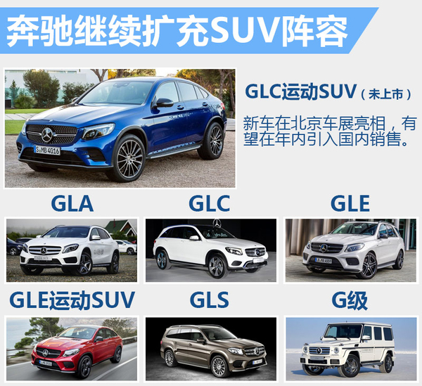 首先SUV领域,从去年开始奔驰在华展开了猛烈的SUV产品攻势,先后推出了基于全新国产GLA SUV、全新GLC SUV以及GLE SUV,再加上在今年上市的GLS,奔驰旗下的SUV车型均完成了换代和改款,也标志着梅赛德斯-奔驰旗下整个SUV车型正式完成新家族名称的更换。GLC运动SUV将在今年下半年的时候以进口形式引入。