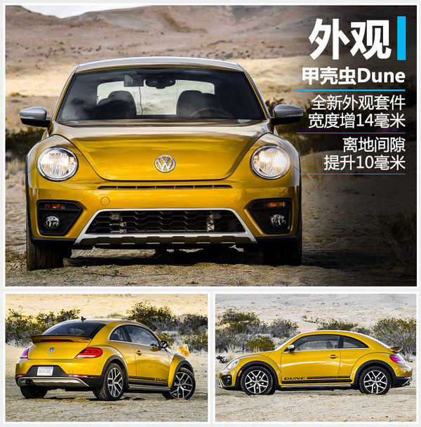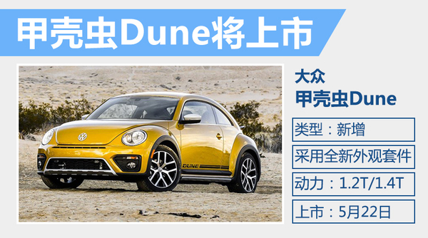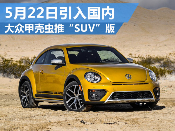 大众此前发布了基于新甲壳虫所打造的“SUV”版本,即甲壳虫Dune,并公布将在2016年导入中国市场。新车相较普通版而言采用了全新的外观套件,同时也有着更高的离地间隙。网通社从大众进口车内部知情人士了解到,甲壳虫Dune将于5月22日正式引入国内并上市销售,两款车型售价分别为23.08万和25.79万元。