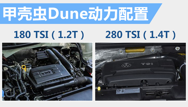 在动力方面,甲壳虫Dune引入国内后,仍将提供现在售车型所采用的1.2T和1.4T发动机,不过预计将采用全新EA211系列发动机,其中1.2T最大功率81千瓦,最大扭矩200牛米,较现款车型分别提升了4千瓦和25牛米。(