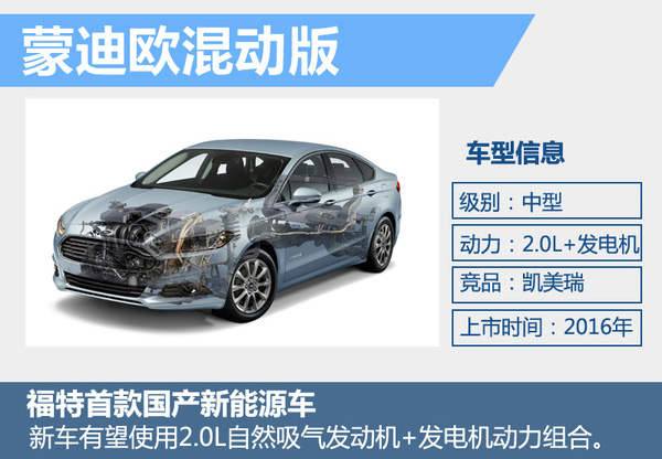 到2020年,新能源车销量占福特全球总销量的10-25%。根据福特在华“创新2020战略”,C-Max Energi插电混动版和蒙迪欧混动版车型年内都将投放市场。目前,福特并未公布蒙迪欧混动版动力信息。福特此前曾展出过一台福特蒙迪欧混动版车型。动力系统由一台2.0升自然吸气发动机、一台电动机以及一个锂电电池组组成,匹配一台eCVT变速箱,城市百公里油耗为4.9升。新车年内上市后主要的竞争对手就是丰田凯美瑞双擎。