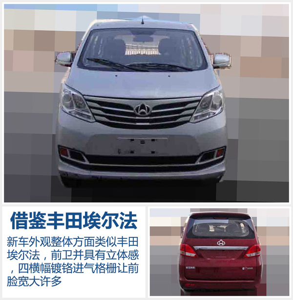 长安全新MPV睿行S50在外观方面有望借鉴丰田老款埃尔法的设计理念,前卫并具有立体感,四横幅镀铬进气格栅让前脸宽大许多,而细长菱形头灯与长安欧尚相仿。新车前脸底部还有一条横向镀铬装饰条,两个雾灯分布左右。车尾中部一条镀铬装饰条与前脸相呼应。
