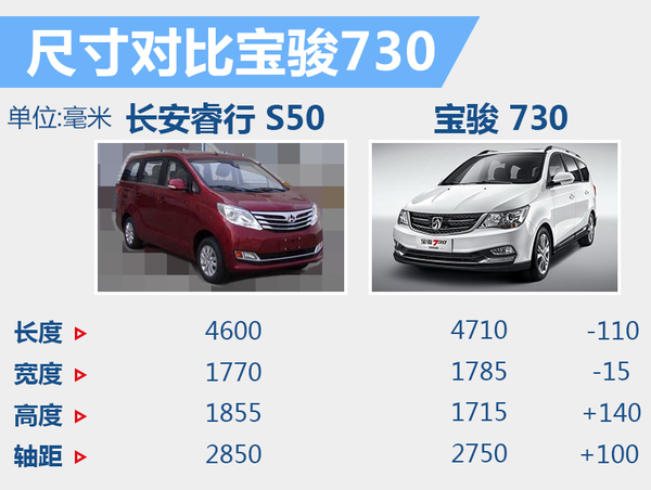 目前国内MPV市场中,五菱宏光和宝骏730常年占据销量榜前两位,未来长安全新MPV上市后将与包括这两款在内的MPV车型处于同一级别。车身尺寸方面,新车的长宽高分别为4,600*1,770*1,855毫米,轴距达到2,850毫米,与宝骏730相比,新车在长度及宽度方面较730减少110、15毫米,在高度及轴距上超出140与100毫米。