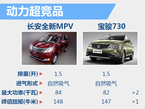 动力方面,新车有望搭载与欧尚相同的1.5升发动机,最大功率为84千瓦,峰值扭矩为148牛米。与发动机匹配的是一台5速手动档变速箱。宝骏730同样搭载一台1.5升发动机,最大功率82千瓦,峰值扭矩147牛米。长安新MPV将相比宝骏730动力小幅领先。