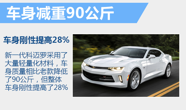 新一代科迈罗采用了大量轻量化材料,车身质量相比老款降低了90公斤,但整体车身刚性提高了28%。在车身尺寸方面,全新一代车型的长宽高为4,784/1,897/1,348毫米,轴距为2,811毫米,与老款车型长宽高4,811/1,917/1,376毫米,轴距为2,852毫米相比,整车尺寸有所减短。