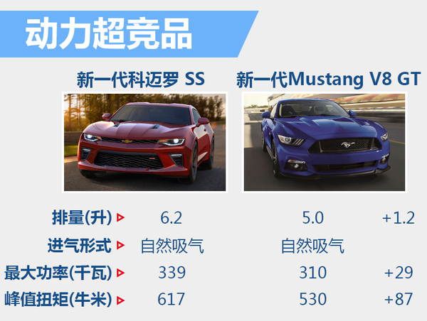 同为美系跑车的代表车型,福特Mustang一直以来都是雪佛兰科迈罗的竞争对手。在2015年初,福特全新一代Mustang在国内正式上市,新车搭载2.3T涡轮增压发动机和5.0升Ti-VCT V8发动机。以两车高性能版为例,全新科迈罗SS要比全新Mustang V8 GT动力要高。此外在车型选择方面,全新科迈罗共有三种动力车型可供选择,相比Mustang的两款车型要更为丰富,对于消费者而言可选择性更多。