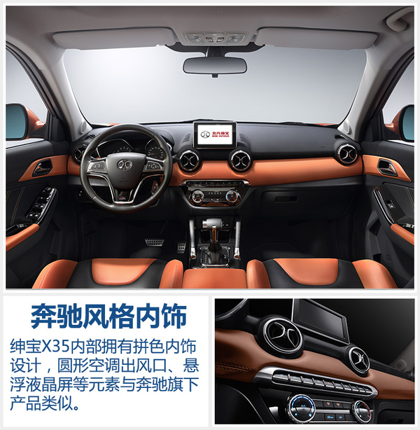 作为绅宝X25的兄弟车型,其内饰风格保持了家族化元素,圆形空调出风口、悬浮式液晶显示屏的造型似乎偷师于奔驰品牌,为内饰整体造型设计增添了亮点,并呈现出不错的协调性。拼色设计的内饰增添了年轻化元素,细节处仿缝线的造型增添了质感与高档感。此外换挡杆及仪表盘的造型设计也颇为拉风。