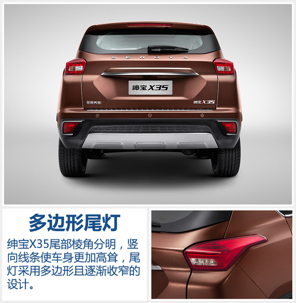 车尾部设计线条硬朗棱角分明,竖向线条的应用使尾部视觉效果更加高耸,增强了气势。精致的尾灯显得十分俊秀,多边形造型并向两侧延伸,倒车灯集成在中间偏下位置。下护板同样为纯黑色,后雾灯的镀铬装饰框也与前雾灯相呼应。尾排采用隐藏式设计,这与时下流行的大口径镀铬排气筒造型相悖,体现出小排量车型环保的一面。