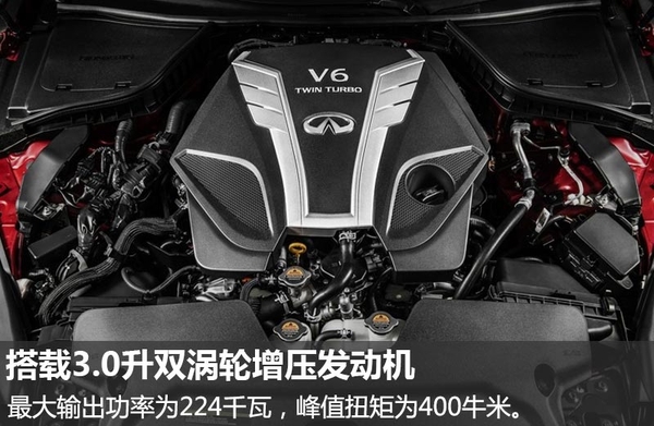 英菲尼迪新Q50配备有3.0升双涡轮增压V6发动机,这款发动机共有两个调校版本,其中低功率版的最大输出功率为224千瓦,峰值扭矩为400牛米;高功率版的最大输出功率为298千瓦,峰值扭矩为474牛米。新车标配后驱,可选配四驱,同时可配备直接可调转向系统、动态数字悬挂、19英寸轮毂、大尺寸制动器、运动化座椅、铝制踏板等。