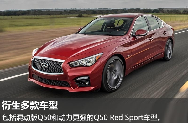 除了3.0T和2.0T车型,英菲尼迪还将推出一款混动版Q50和动力更强的Q50 Red Sport车型。其中,混动版Q50搭载有3.5升V6自然吸气发动机和一台电动机,最大综合输出功率可达268千瓦;而Q50 Red Sport同样搭载有3.0T发动机,但最大输出功率和峰值扭矩分别可达到298千瓦和474牛米。