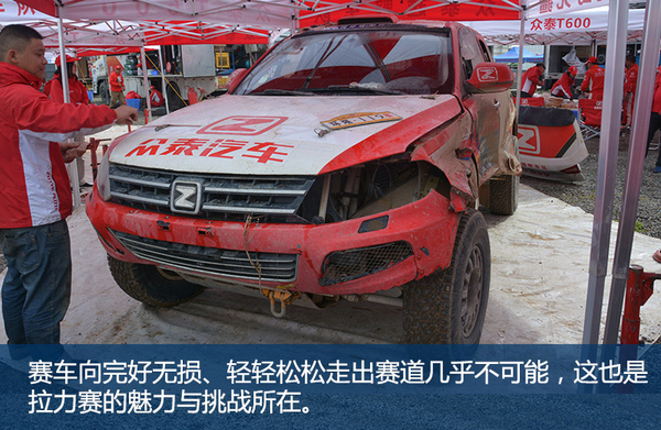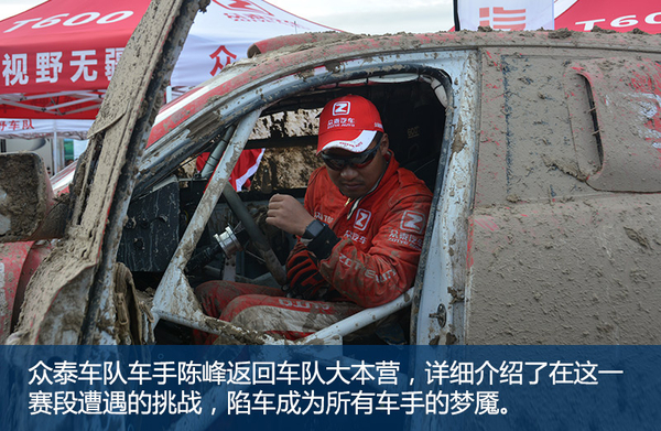 据众泰车手陈峰介绍,在出发几十公里处,很多车就陷在泥泞的道路里。但只能从这条路通过,所以陈峰尝试了几次绕路,也遭遇了陷车。他说:“不敢想象的泥泞,3挡顶满油门往前冲,稍微一松,车子就陷进去了,就再也动不了,泥的粘度特别大,千斤顶也顶不起来。”在陈峰看来,这是他多年以来碰到的最艰难的赛段。他说:“不光是中国赛事,甚至国际赛事也没有这样的情况。所以我们选择结伴而行,几台车相互救援,在那个时候成绩已经不重要了,越野的精神体现出来,顺利走出来,这就是大家的信念。”