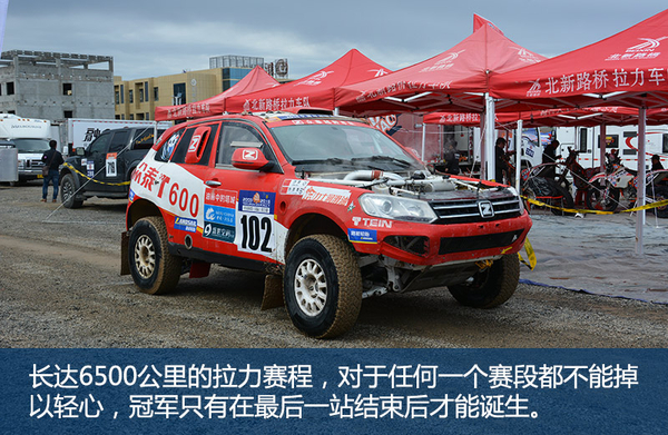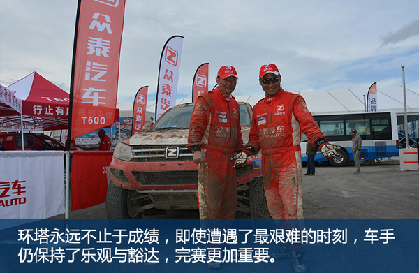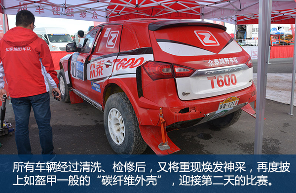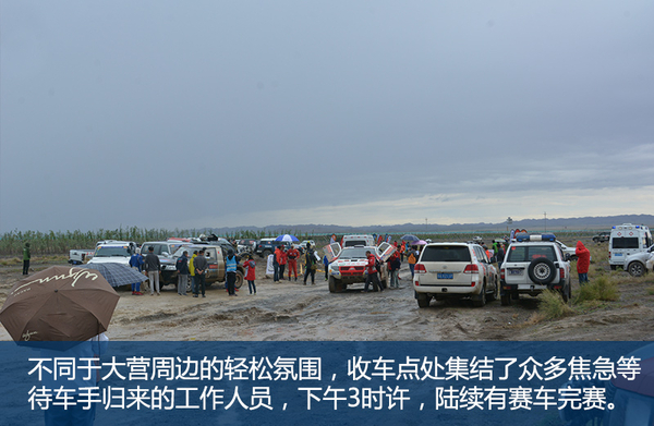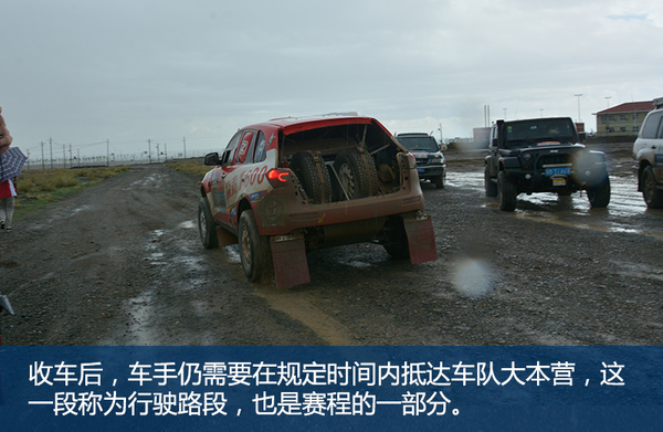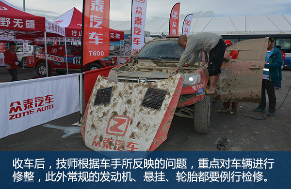 结语:环塔拉力赛又一天的比赛结束了,300公里的赛段,包含草原、戈壁等艰难路段,近4个小时结束战斗,环塔勇士们完成了十二分之一的挑战。后勤保障人员早已在大营等待他们,收车,清洗,检修,奔向下一赛段。对于首次参赛的众泰越野车队而言,第一赛段顺利完成任务。