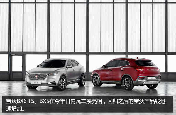 在日内瓦车展中,宝沃发布品牌LOGO,并未展出真正产品,转至同年的法兰克福车展,宝沃BX7正式亮相,在德国本土宣布宝沃的真正归来。而在今年的日内瓦车展当中, BX5,BX6 TS亮相,仅仅一年时间就有三款车型问世,宝沃回归显得来势汹汹。在不久前,BX7还在北京车展当中正式上市,售价区间为16.98-30.28万元。按照计划,未来企业还将按照每年两款全新车型的速度将产品线迅速铺开。