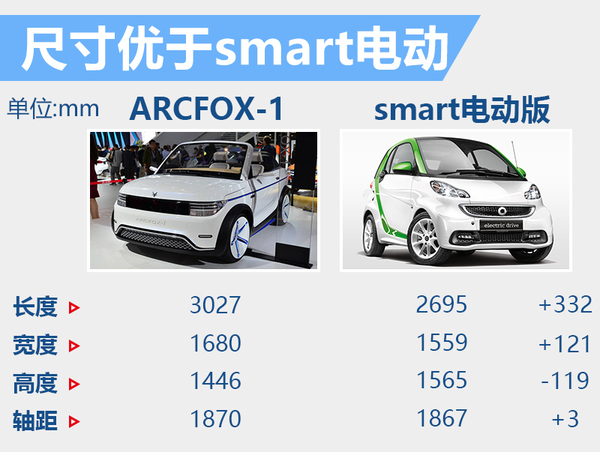 ARCFOX-1纯电动车的长宽高分别为3027*1680*1446毫米,轴距为1870毫米,与同级别代表产品smart电动版相比明显更长、更宽。与此同时,由于车身高度比smart电动版低了119毫米,其外形看上去也更加运动。铝合金框架式车身及非金属外覆盖件的轻量化车身,在保证强度的前提下极大的降低了整车重量。