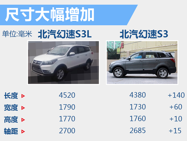 北汽幻速在2015年整体销量实现同比增长164%,今年以来销量保持增长势头,目前旗下拥有3款SUV车型,根据规划,还将在今年推出6款新车。网通社获得了一组北汽幻速SUV车型的谍照及信息,新车将是幻速S3的加长版车型,将命名为S3L,尺寸方面较现款车型有着大幅提升。此外,新车在外观上也进行升级,进气格栅部分酷似雷克萨斯车型的纺锤式格栅,动力方面将搭载一台1.5升自然吸气发动机。
