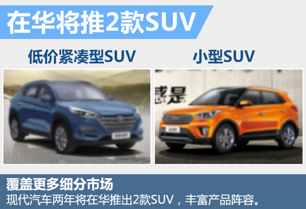 现代2015年在华推出了全新途胜,新车作为换代车型,动力率先搭载1.6T涡轮增压发动机,传动系统匹配7速双离合变速器,技术上实现了革新。同时,这也为消费者提供了更多的动力选择。在SUV领域,现代汽车还将在华推出一款廉价紧凑型SUV和一款小型SUV,覆盖紧凑型SUV和小型SUV更多细分市场。此外,低价紧凑型SUV将于沧州工厂投产,小型SUV在重庆工厂投产。