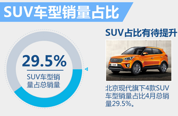以北京现代为例,4月份单月销量9.6万辆,其中ix25销量9,181辆,ix35 6,145辆,全新途胜11,150辆,全新途胜1,855辆,SUV车型销量共28,331辆,占比总销量29.5%。根据汽车工业协会最新公布的消息,今年1-4月份,SUV产销持续高速增长,分别为46.8%和46.3%。北京现代销量主要以轿车为主,SUV占比不足三分之一,不过未来北京现代将推出多款SUV车型,将有望提升至这一占比。